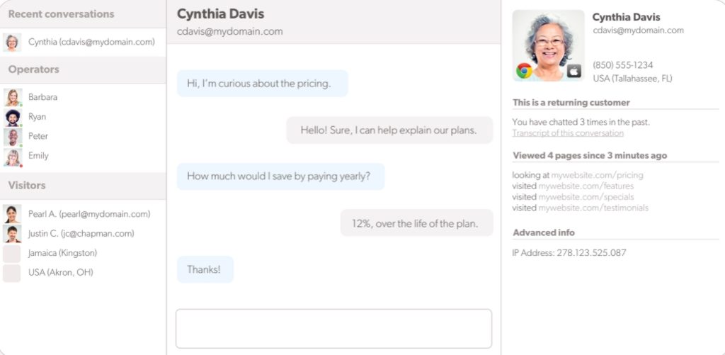 A plataforma de chat online do Olark é uma das que mais oferecem informações sobre os visitantes de seu site. Ele demonstra quem está conectado à sua loja, quais páginas estão a visitar e inclusive saber o que ele está colocando em seu carrinho de compras, permitindo prestar auxílio e evitar que o cliente abandone suas compras. Outras funcionalidades incluem a possibilidade de criar grupos de atendimento por setor e integração com o Google Analytics. Clique no link para conhecer o Olark.